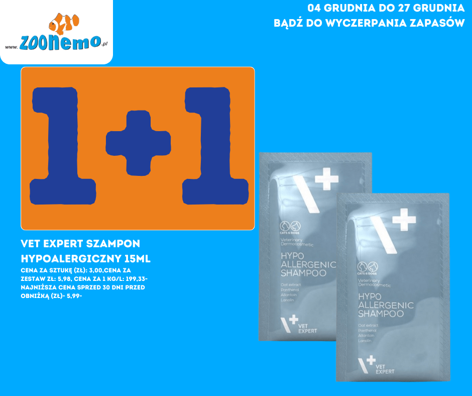 VET EXPERT Szampon Hipoalergiczny 15ml: Skorzystaj z promocji 1+1 GRATIS! Zadbaj o delikatną skórę i sierść swojego psa. Cena za zestaw 2 szt.: 3,00 zł. Najniższa cena sprzed 30 dni: 5,99 zł/szt.