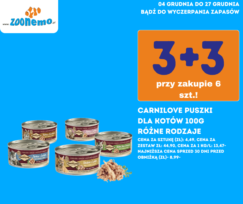 Carnilove Puszki dla Kotów 100g (Różne Rodzaje): Kup 3, a 3 dostaniesz w prezencie! Promocja 3+3 GRATIS przy zakupie 6 sztuk! Cena za zestaw 6 szt.: 26,94 zł. Najniższa cena sprzed 30 dni: 8,99 zł/szt.
