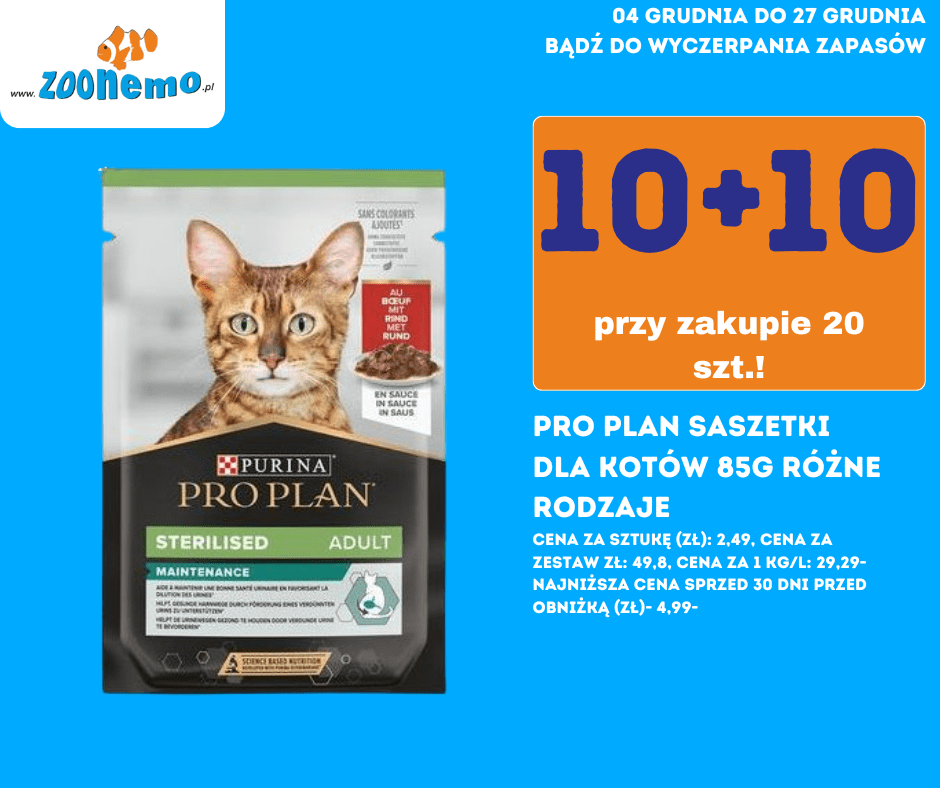 Pro Plan Saszetki dla Kotów 85g (Różne Rodzaje): Rewelacyjna oferta 10+10 GRATIS przy zakupie 20 sztuk! Cena za zestaw 20 szt.: 49,80 zł. Najniższa cena sprzed 30 dni: 4,99 zł/szt.