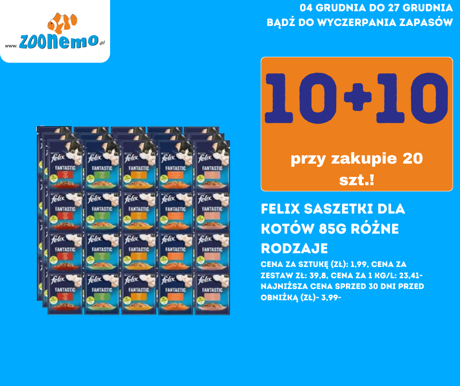 Felix Saszetki dla Kotów 85g (Różne Rodzaje): Idealne na święta w promocji 10+10 GRATIS przy zakupie 20 sztuk! Cena za zestaw 20 szt.: 39,80 zł. Najniższa cena sprzed 30 dni: 3,99 zł/szt.