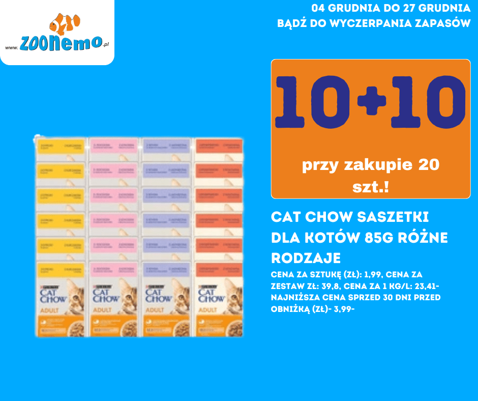 Cat Chow Saszetki dla Kotów 85g (Różne Rodzaje): Również super okazja 10+10 GRATIS przy zakupie 20 sztuk! Cena za zestaw 20 szt.: 39,80 zł. Najniższa cena sprzed 30 dni: 3,99 zł/szt.